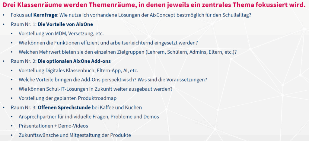 Die Anmeldeseite für die AixConcept vor Ort Tage (29.10.2025 – weiterführende Schulen & 30.10.2025 – Grund- und Förderschulen) in Herne ist freigeschaltet.