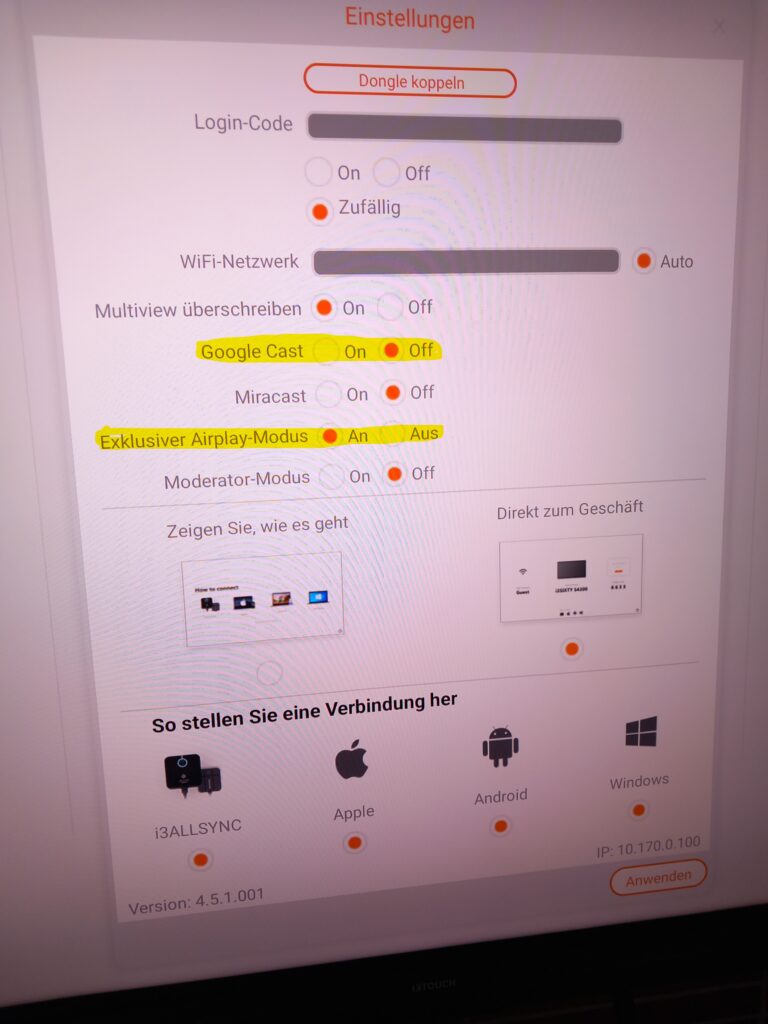 Die Einstellung “Exklusiver Airplay-Modus” muss aktiviert und “Google Cast” deaktiviert werden. Danach die Einstellungen ” Anwenden“.